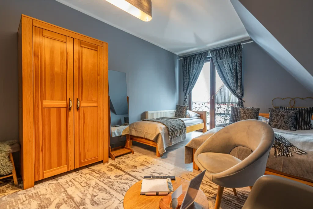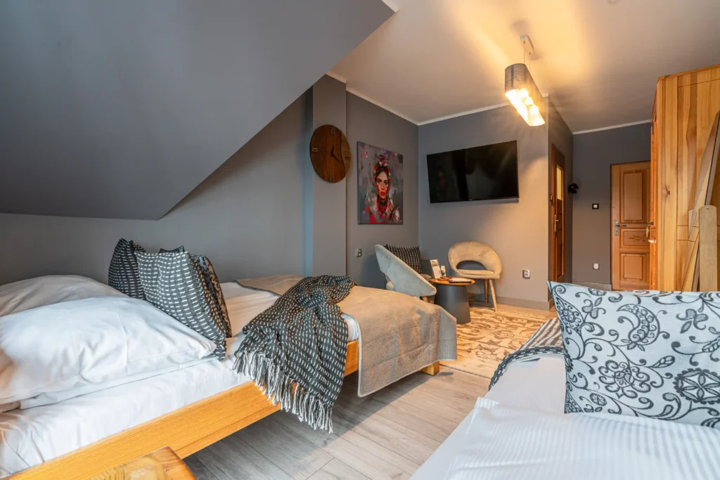 Pokochaj klimatyczne wnętrza, stworzone z myślą o Twoim relaksie. Zadbaliśmy o wszystkie detale, aby Twój pobyt w Folkowym Dworku był niezapomniany. W każdym pokoju znajdziesz wygodne łóżka, mięciutkie dodatki, drewniane meble i unikalne wzornictwo. Dodatkowo w obiekcie czeka na Ciebie mnóstwo udogodnień oraz smaczne śniadania. Wybierz sprawdzone pokoje Murzasichle i ciesz się wyjątkowym pobytem w górach.<